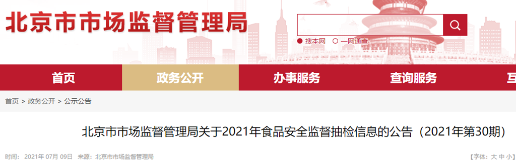 北京市市場監(jiān)督管理局關(guān)于2021年食品安全監(jiān)督抽檢信息的公告(2021年第30期)